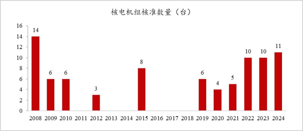 由于核电有5-6年的建设周期,2014-2024年10年的业绩水平与2008-2018年的审批数据大致相对应。在此期间,由于福岛核危机的影响,中国核电行业长期处于冰冻期。十年来,共批准了37台机组,但现在四年内批准了41台机组,节奏和强度明显高于以前。