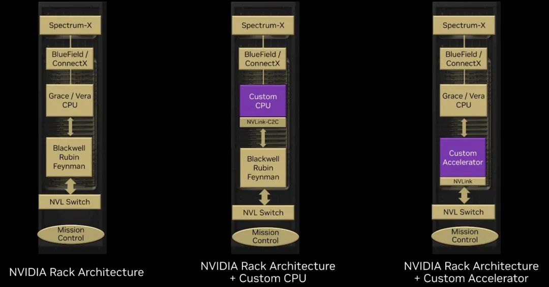 另外一个用例是使用 Nvidia 当前的 Grace CG100 Arm Cpu或 Nvidia 未来的“Vera”CV100 CPU,以及 NVLink C2C 芯片之间的互连,连接到包含 NVLink Fusion 端口定制加速器。相同的前面 Spectrum-X 和 BlueField/Connect-X 网络和同样的东西 NVSwitch 和 Mission Control 后端网络围绕着它。类似地,目前还不清楚这是否会发生。 NVLink 在定制加速器中加入端口是必要的。