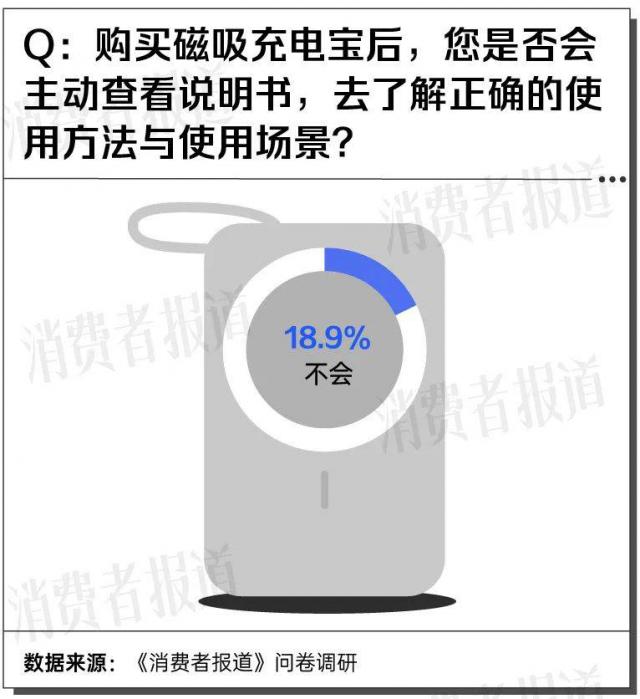 充电宝使用不当也是造成安全隐患的关键因素。根据《消费者报告》问卷调查数据, 18.9% 受访者不会轻易查看说明书,了解磁性充电宝的正确使用方法和使用场景。因此,我们总结了使用充电宝的注意事项,仅供消费者参考。
