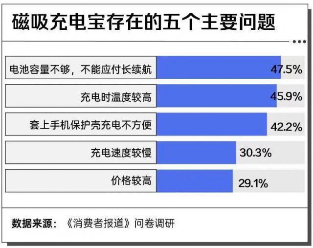 然而,磁性充电宝在使用过程中存在许多问题。47.5% 受访者表示,电池电量不足,无法应对长续航;45.9% 受访者认为充电时温度高;42.2% 一些受访者觉得套上手机保护壳充电不方便。