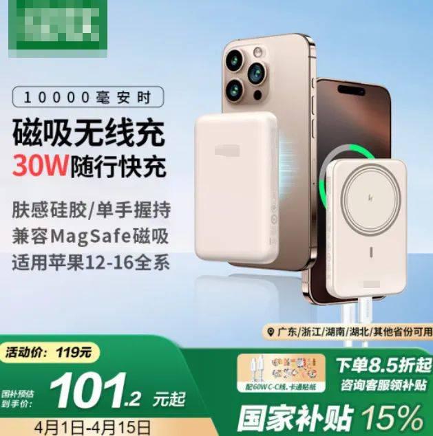 此外,记者在电商平台上注意到,部分地区响应了加大实施“两个新政策”的号召力度,为购买磁性充电宝的消费者提供了 15% 政府补贴。