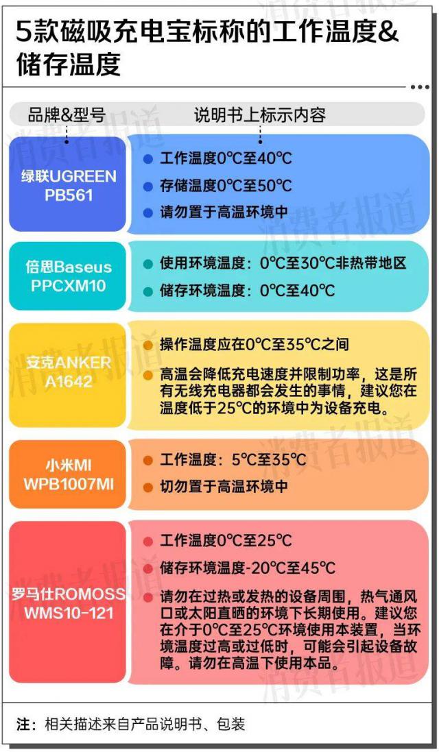 首先,在高温环境下不要使用充电宝,这可能会导致爆炸和火灾事故,危及人身安全。因为充电宝电芯所承受的温度上限一般是 60 ℃。在高温下,车内暴露在阳光下,长时间暴露在阳光下,长时间放在包里或口袋里等不利于散热的环境。这次测试的 5 以磁性充电宝为例,它们的工作温度都在 40 低于℃,安克和罗马仕的说明建议用户在低于温度的情况下使用。 25 在℃的环境中充电。也就是说,在夏季炎热的天气里,我们尽量不要在户外使用磁性充电宝。