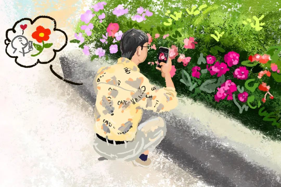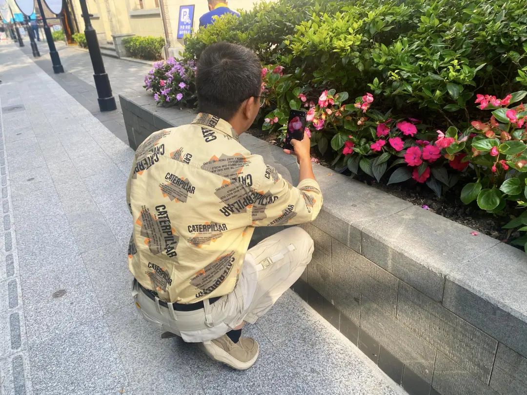 蹲在花坛边半天的花衬衫男人,仔细欣赏绿叶中的红花紫萼。爱花不是女人的专利。每个热爱生活的人都会知道如何欣赏藏在角落里的小运气。