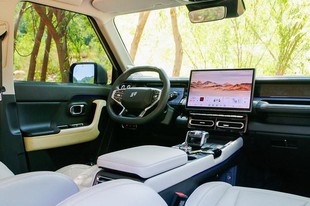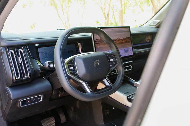 2025 款山海 T1 内饰设计同样没有太大变化,平坦的仪表台组合 15.6 一寸悬浮式中控面板,看起来十分简洁干练。并且车内还配有多个位置的扶手,方便越野时身体平稳。