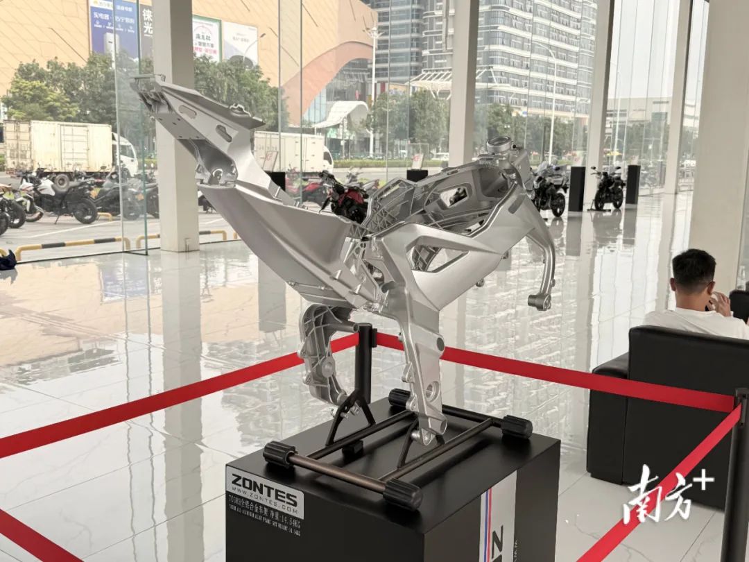 “这是我们的旗舰车型703F,配备了国内首款高性能大排量三缸发动机,全球独创的一体化压铸铝合金双翼梁车架,一体化舒适座垫。谈到旗舰车型的“黑科技”,陈洪彬滔滔不绝。“作为一款冒险车型,这款摩托车配备了前21英寸和后18英寸的轮胎,兼顾了越野支撑和高舒适性。同时配备了无钥匙系统、电动挡风玻璃、护杠、雷达等设计,让摩托车也能实现智能化、便捷化、安全化。”
