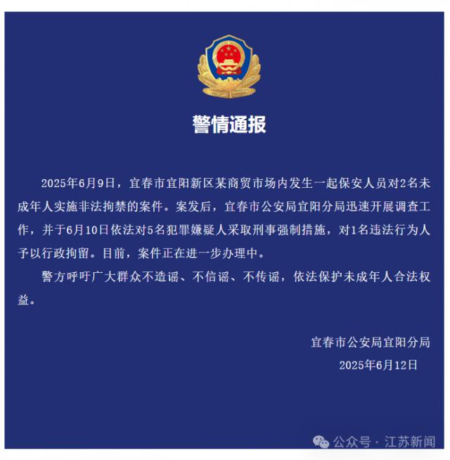 6 月 9 日本,宜春市宜阳新区某商贸市场发生了一名保安。 2 未成年人实施非法拘禁案件。事件发生后,宜春市公安局宜阳分局迅速开展调查工作,并于 6 月 10 日依法对 5 犯罪嫌疑人采取刑事强制措施, 1 名义上的违法行为人被行政拘留。当前,案件正在进一步处理中。