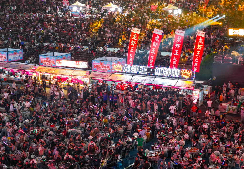 夜幕降临,夏风包裹着龙虾的香味。据悉,“快乐龙虾宴”将持续3天,已售出3万张票,预计售出100吨左右的龙虾。以虾为媒,盱眙正以最真诚的方式,让每一个来这里的人都能满足和快乐,记住这座城市的温度。
