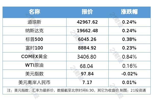 三大股指纽约股市 6 月 12 日上涨。截至当日收盘,道琼斯工业平均指数较前一交易日上涨。 101.85 点,收在 42967.62 点,涨幅为 0.24%;标准普尔 500 股票指数上涨 23.02 点,收在 6045.26 点,涨幅为 0.38%;纳斯达克综合指数上涨 46.61 点,收在 19662.49 点,涨幅为 0.24%。
