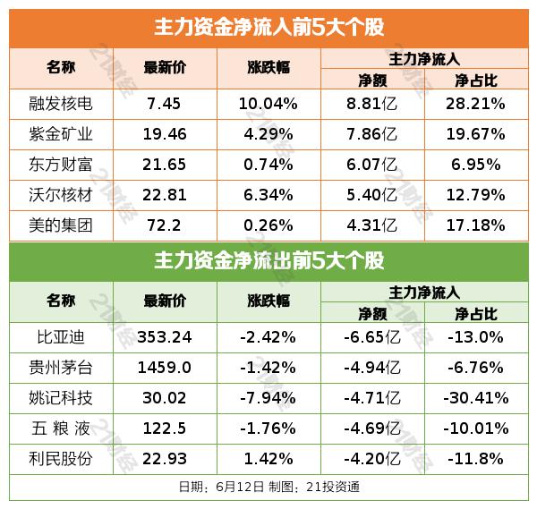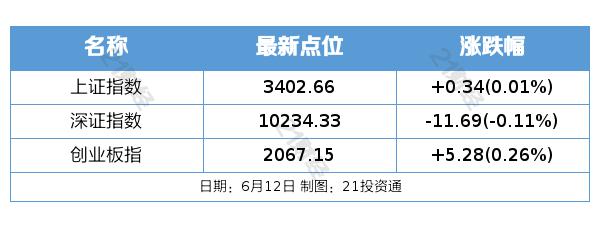6 月 12 日,A 今天三大股指涨跌不一,截至收盘,上证指数涨跌不一。 深成指下跌0.01% 创业板指涨0.11% 0.26%,北证 50 指数跌 0.25%。整个市场成交量 13035 与前一天相比,亿元放量 169 亿元。全市场超 2300 只有股票上涨。板材主题,永磁材料,量子技术,IP 经济、汽车零部件板块涨幅居前;农业、猪肉板块跌幅居前。
