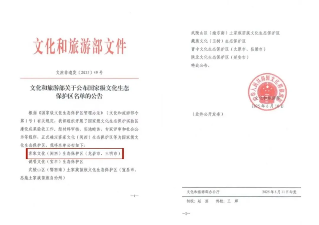 文化与旅游部于2025年6月10日发布国家文化生态保护区名单通知,成功入选三明市名单。
