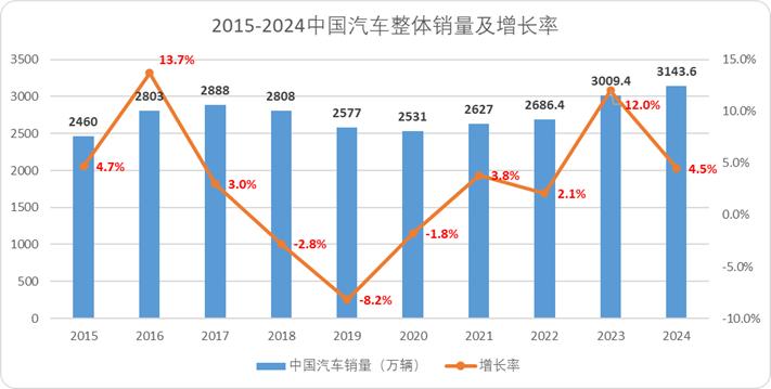 图片:2015-2024中国汽车整体销量及增长率,来源:中国汽车工业协会