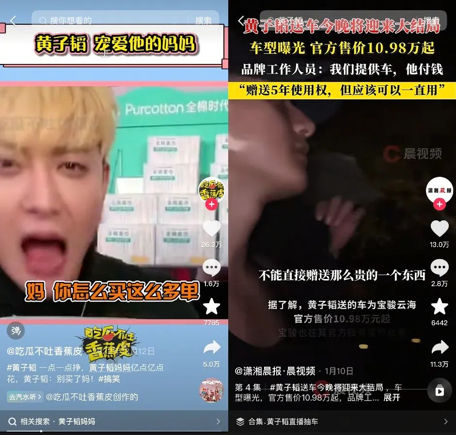 因为Aautorapper和Tiktok是月活上亿的电商平台,黄子韬作为主播带来的商品大多是日用品和美容护理。为了吸引更多的粉,远望科技结合黄子韬的性格,为他树立了一个接地气的直爽人,也促进了一系列热点事件帮助他吸引人气,比如: