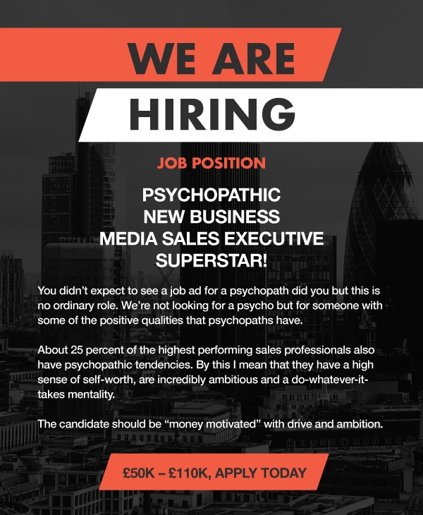 一家英国公司于2016年发布广告,招募“精神变态新业务媒体销售经理超级明星,50,000-110,000英镑”。CREDIT: KNOWABLE MAGAZINE