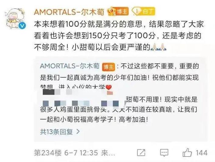 举例来说,2022年尔木萄在其官方微博上发布了“高考加油,100分冲鸭”的文案,便被指“没脑子”“没文化”,因为高考语数外单科满分为150分。