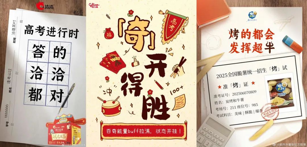 格力高旗下的百奇喊出了“奇开得胜”的口号,脆升升通过自己的炭烤和牛味薯条给出了更丰富的祝福——“烤都会,发挥超牛”。洽洽不仅在考试期间连续三天导出同音异义词祝福,还与董鹏特饮和王老吉合作,成为高考季同音异义词梗导出最多的品牌。