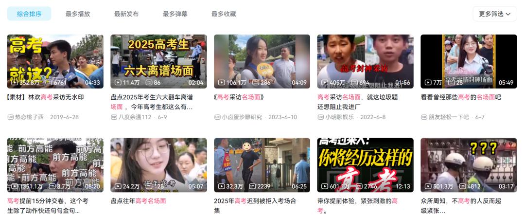 对于哔哩哔哩来说,高考访谈名场景已经成为每年固定的百万播放爆款,也是鬼畜区最好的素材库。十年前,关晓彤因考试后采访一战成名,坐稳了学霸人设。六年前,化名“林欢”出场的考生面对媒体已经看得乱七八糟,成了每年考古的名景。今年,三名考生纷纷发言樊振东重返赛场,直接冲上热搜高位。近几年,带牌,出cos。、一系列“花样接考生”活动,如举条幅,也成为集中发力区。