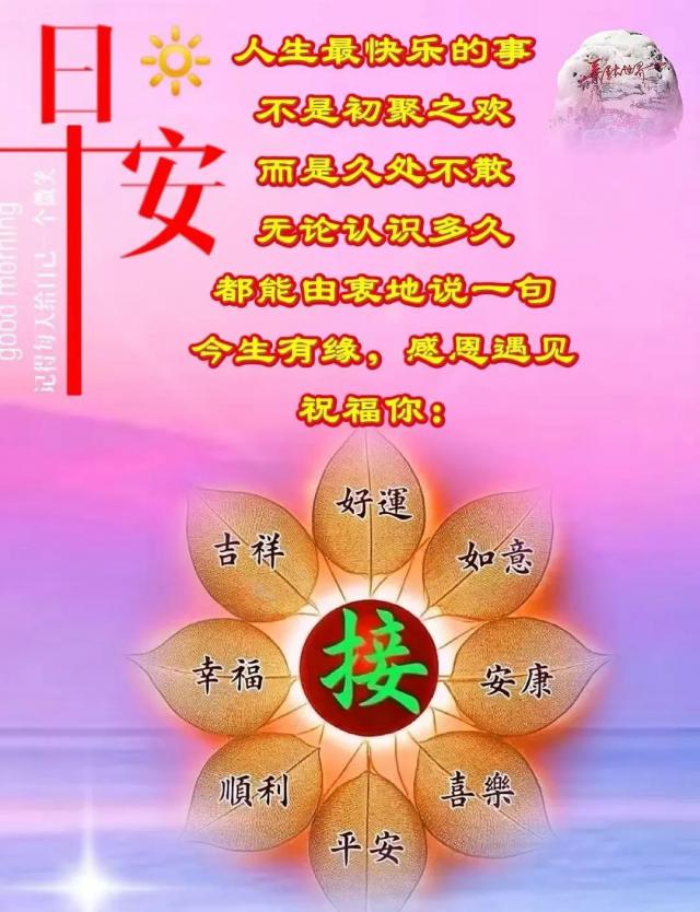 时间雕刻了生活的精彩;联系,升华了美好的生活;问候温暖了彼此的心;祝福永远是我的心!淡淡的语言留下芬芳,温柔的问候长久的感情。我们不想聚在一起,但我们希望彼此健康。早上好,朋友!