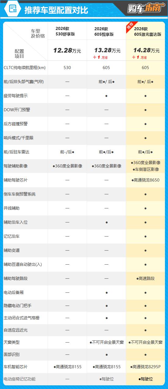 对于 2026 款零跑 C10 个人推荐的消费建议是: 605 激光器雷达版和 210 激光雷达版。其中,与增程版相比,纯电动版的热泵空调、主动关闭进气格栅和单踏板模式更多,但没有发动机电子防盗,价格更高。 1 万元,其它设备两者完全一致。