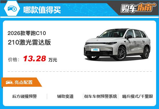 2026 款零跑 C10 增程入门级车型是厂家指导价。 12.28 万元的 210 与同价位的版本相比,悦享版 530 舒享版,其配置水平有所提高,如协助停车入位、电动后备箱、前备箱、 / 后排头部气囊 ( 气帘 ) 等等都有配置。虽然设备水平不低,但是由于有性价比较高的车型提供,所以这款增程入门级车型也不推荐。