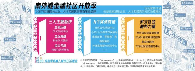 “南外滩金融社区开放季”是面向企业、人才和社区的小东门街道创新商业服务品牌。南外滩金融社区开放季将融入城市 ESG 理念,以低碳宜居的环境、幸福和谐的社会、协同共生的治理为愿景,聚焦城市生态、绿色金融、社会服务、社区共创、城市创新、绿色共治等问题。在社区工作生活中,与街道青年理论小组联动,对建筑白领进行精细化、定制化的服务需求调查。同时,积极构建企业员工和社区居民与社区商业实体的日常消费需求之间的链接机制,立足不同维度,推动南外滩金融社区高质量可持续发展。