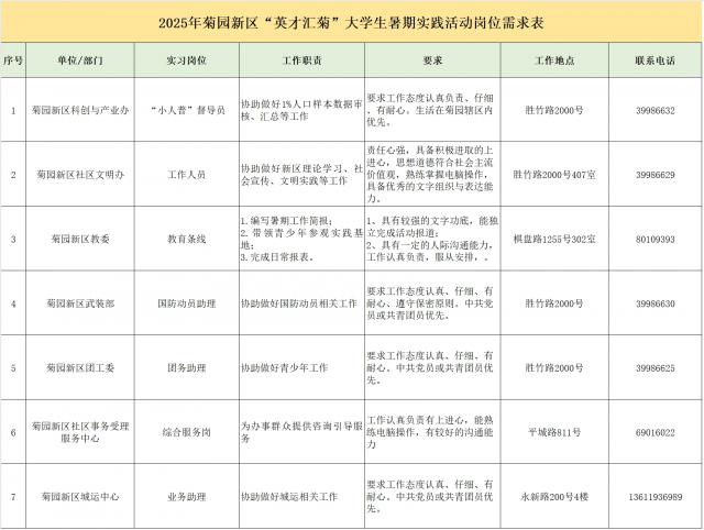 菊园新区机关、企事业单位提供相关实习岗位,为大学生提供政务、公司、基层等工作实践。根据各单位的实际需求,结合个人行业领域和实际意向,通过双向选择和最佳选择,确定实际岗位。
