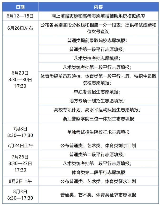 6月29日8:30—6月30日17:30 符合要求的考生填写提前录取学校、第一阶段平行录取、高校专项计划、高水平运动队、地方专项计划、浙江警察学院三位一体招生志愿者。