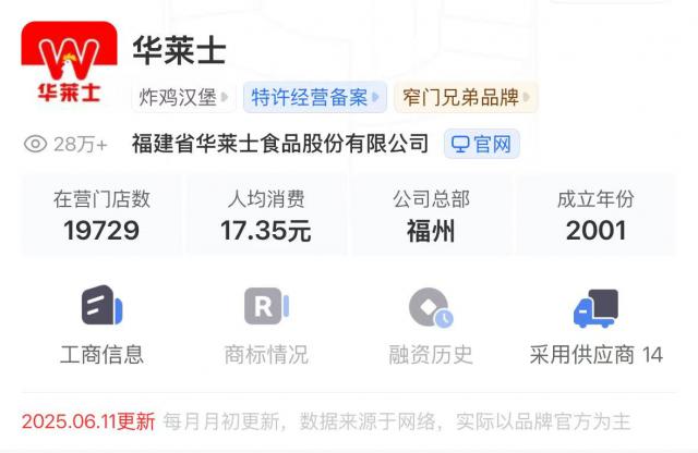华莱士属于华士食品,主要销售炸鸡、汉堡、薯条等商品。窄门餐眼显示,截至 2025 年 6 月 13 日本,华莱士的门店数量已经达到。 19729 家,覆盖 31 个省份、357 城市,是同类餐饮行业的巨头。
