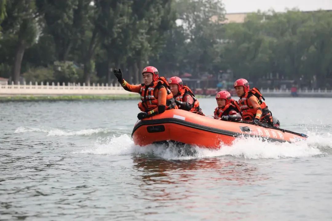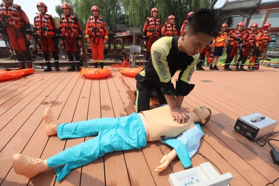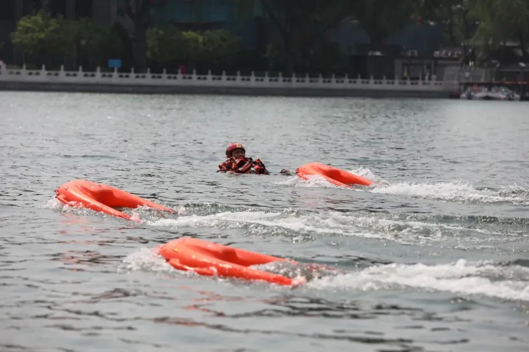 目前,北京已进入汛期,随着天气炎热,人们的亲水休闲活动越来越多。6月12日上午,来自西城区消防救援支队的6个消防救援站在西城区什刹海开展了防汛救援综合演练。