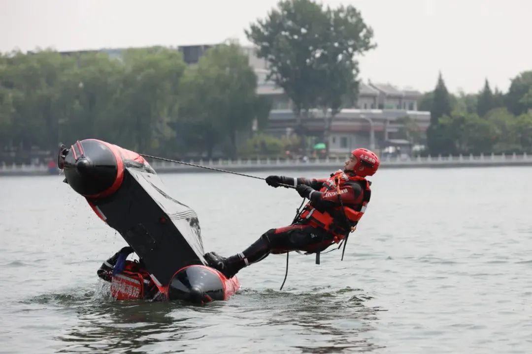 消防队员不仅要能救援,还要能自救。在“翻船自救”科目中,三名队员在水中默契配合,船只在2分钟内拉直,全体队员登船,展示了恶劣水域环境下的应急能力。