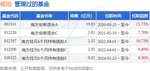 2025年证券之星消息 年 6 月 14 日本,南方宝恒混和(011033)发布公告,增聘杨旭为基金经理,就职日期自 2025 年 6 月 14 日起,杨旭是南方宝恒混合(011033)基金经理。 , 孙鲁闽。截至 2025 年 6 月 13 日本,南方宝恒混合净值为 与前一天相比,1.1353下跌 近一年来,0.17%上涨。 3.63%。