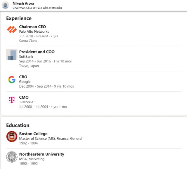 美国科技行业的超级农民工绝对有印度人选手的份额。最后,我们来谈谈 Palo Alto Networks 董事长兼 CEO 的 Nikesh Arora,从 LinkdeIn 上清一水" C “字开头的职位可以窥探他的“工作实力”: