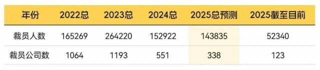 根据类似的时间比例法,在假设全年裁员速度与当前一致的前提下,我们将截止日期。 5 月 12 每日裁员数据 52,340 以此为依据,按到目前为止的天数占全年的比例(约) 36%)进行线性外推等比例, 2025 对年度总裁人数和公司人数进行粗略预测。� �