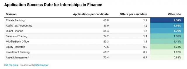 Trackr 通过对金融服务实习生申请人提交的申请和录用数据的调查,得出了上述数据报告。总的来说,除了 Private Banking,其他部门的申请通过率都低于 2%。(p.s. 去年哈佛大学的录取率是 3.59% ……)