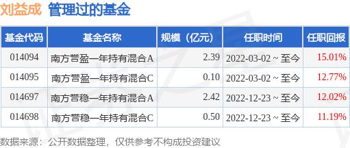 刘益成先生:中国国家,硕士学位,硕士学位,北京大学计算机应用专业硕士,特许金融分析师 ( CFA ) ,具有基金从业资格。曾担任招商银行金融市场部债券交易员、投资账户经理助理、投资经理。2014 年 1 每月加入南方基金 ;2014 年 6 月 10 日至 2022 年 3 月 2 每天,任投资经理 ;2022 年 3 月 2 到目前为止,任南方誉盈每年都有混合基金主管。2022 年 3 月 2 日起担任南方誉盈一年持有期混合型证券投资基金经理。2022 年 12 月 23 日本是南方誉稳一年持有期混合型证券投资基金的基金经理。