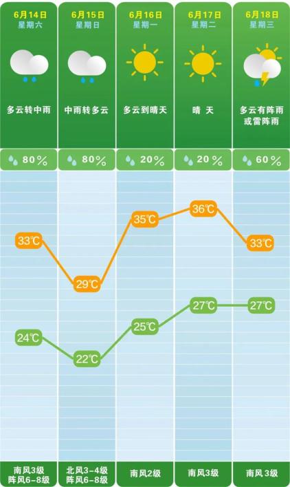 十四日,长沙阴天转中雨,望城北部、长沙县北部暴雨,南风3至4级,阵风6至8级,24℃至33℃。;