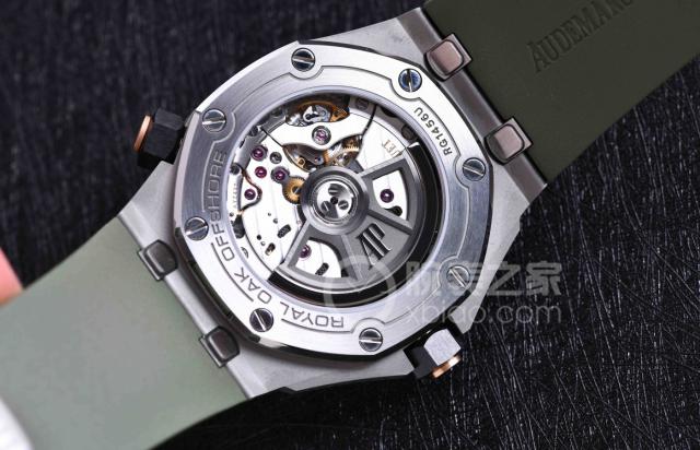 手表背面采用蓝宝石表镜玻璃透底设计,可以直接看到爱彼的标志性镂空摆动,上夹板的日内瓦图案装饰,下夹板的珍珠图案装饰,非常具有观赏性。外面是精钢,上面刻着手表的相关信息,排列整齐,做工精细。