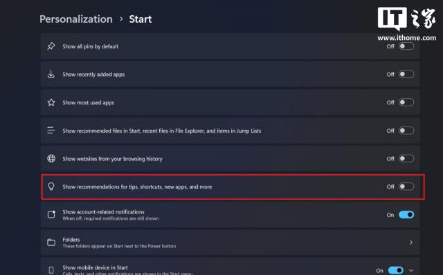 Win11 24H2 测试新功能:关闭菜单栏中的“推荐栏”