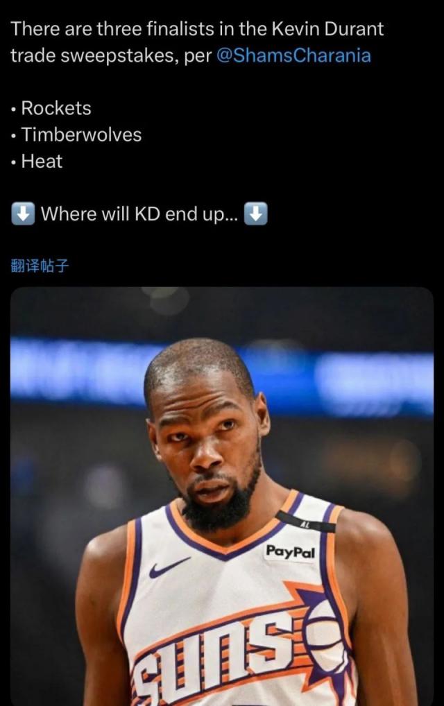 对于杜兰特最新的交易情况,情况基本明朗,也许在接下来的几天内完成,火箭队、森林狼和热火是目前正处于中心地区的新家。