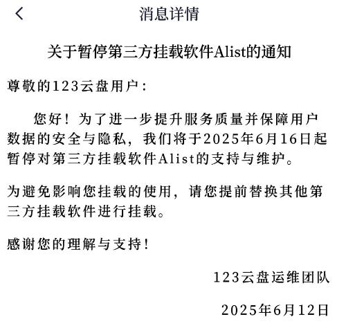 123为保护用户隐私, 网盘率先表示,暂停对 AList 支持与维护。
