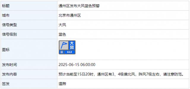 估计现在到今天(6 月 15 日)20 时间,通州区有 3、4 级偏北风,阵风 7 等级左右,请注意预防。