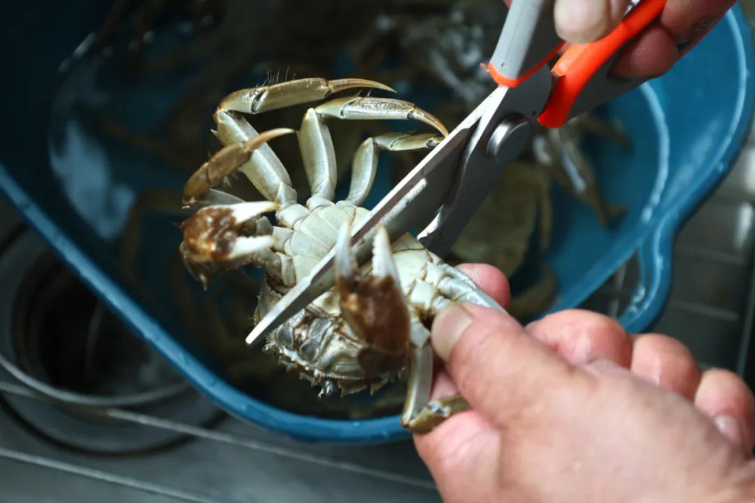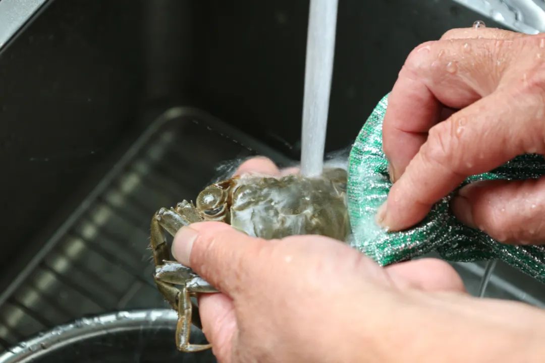 处理六月黄的Step1:用刷子清洁六月黄的表面,将蟹对半切开。