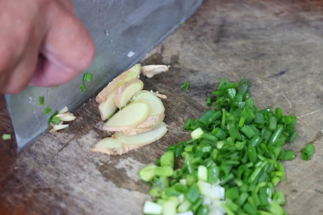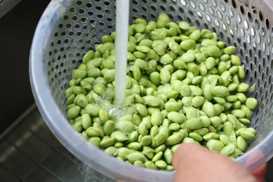 备料:葱切段,姜切丝;毛豆洗净沥干水分备用。