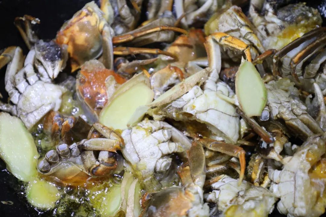 Step4爆香调料:蟹煎好后,加姜蒜炒出香味。