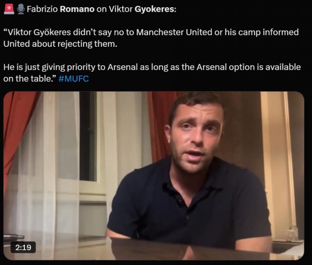 法布里济奥意大利转会专家 · 罗马诺解释说:「哲凯赖没有直接对曼联说不,或者让他的经纪人拒绝曼联。他只是优先考虑阿森纳。只要阿森纳出价,他就会更喜欢转会他们。」