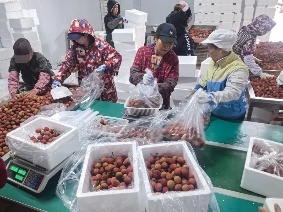 记者还走访了灵山县两家规模较大的老牌电商企业。在灵山昊扬食品有限公司的冷链仓库,记者看到了一个繁忙的场景。工人们分组对当天购买的荔枝进行预冷处理后,对包装箱进行分拣,然后用叉车送到冷链车上。"满一车就走,当天货出。我们主要走电商渠道,购买价格比大宗购买高,对水果的质量要求更高。目前我们收4元左右的白糖罂粟上市,妃子笑3元左右,主要看质量。质量好的价格会更高。”昊扬食品有限公司总经理邓洪庆说。据悉,昊扬食品公司自6月6日起收购荔枝以来,灵山荔枝畅销全国。另一家电商公司千年荔缘公司总经理张善松告诉记者,这几天千年公司平均每天卖荔枝6-7公斤左右,主要是妃子笑和糖罂粟。今天的收购价也是妃子笑3元左右,白糖罂粟4元左右。