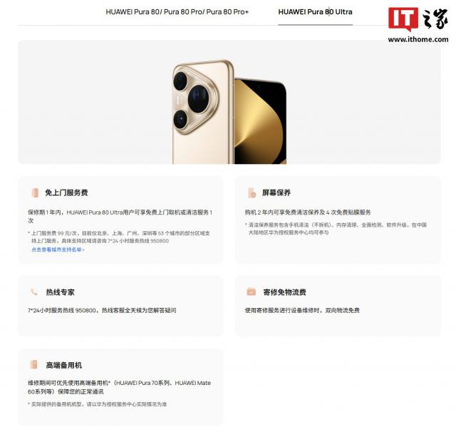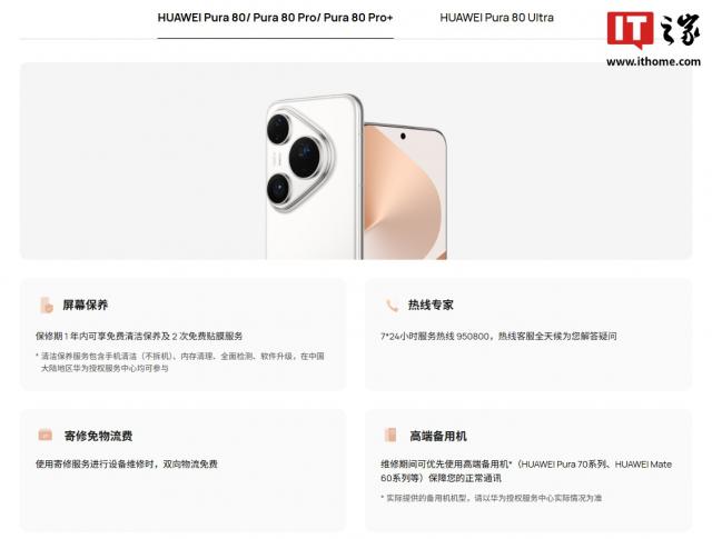 IT 世界注意到,华为官网现在已经公布了。 Pura 80 手机服务的一系列权益,包括维修期间的免费清洁保养、高档备用机等。详细信息如下: