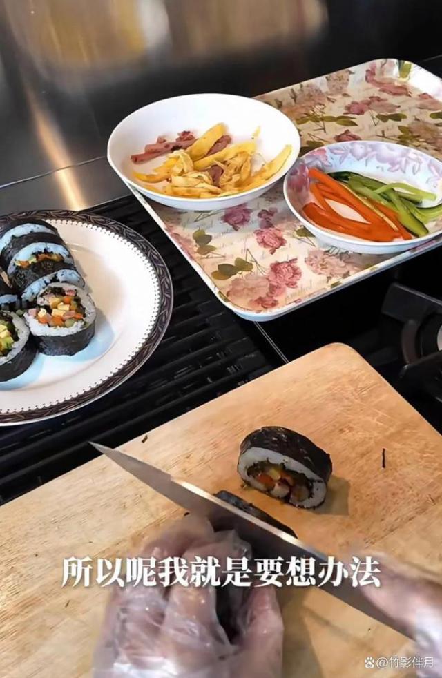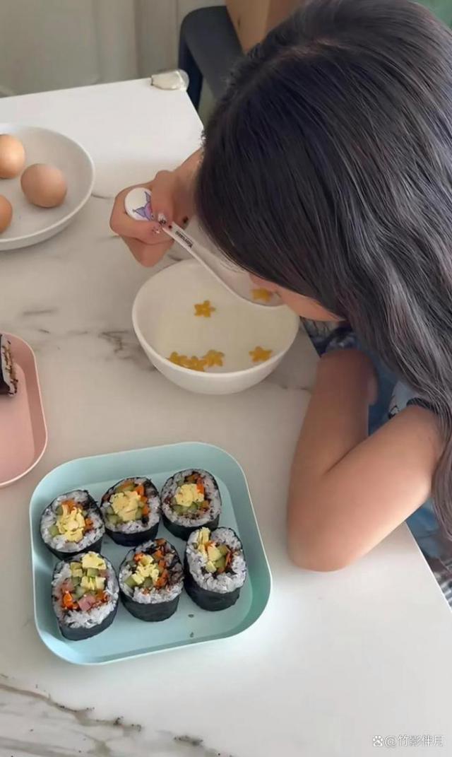 镜头晃进厨房,她熟练地卷着寿司,一边煎蛋,一边热牛奶,嘴里还念叨着:“希希最近胃口不好,得换点花样。”