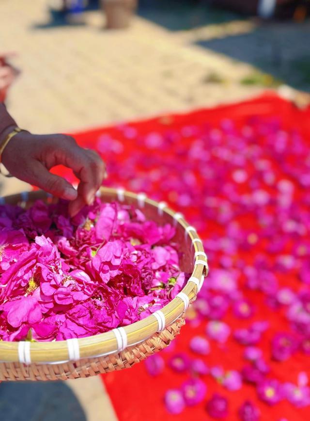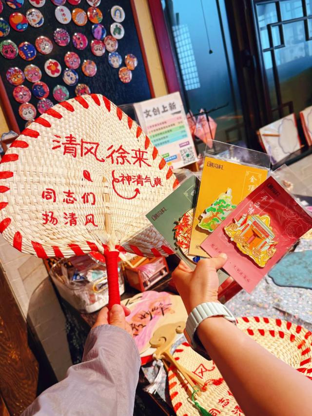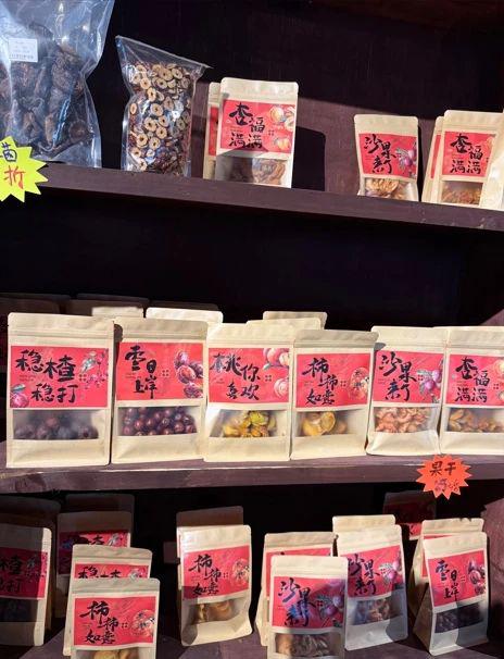 妙峰山特产玫瑰酱、玫瑰茶、玫瑰纯露等。,都是大自然赠送的;当地村民手写的“胜”字印的帆布包,承载着对美好生活的期待;远道而来的蔚县农家果干,装在“枣日上岸”、“桃你喜欢”、“柿子如意”、“杏福满满”的袋子里,为正宗的风味增添了吉祥的寓意;大学生设计的妙峰山元素冰箱贴,价值在线,火爆。