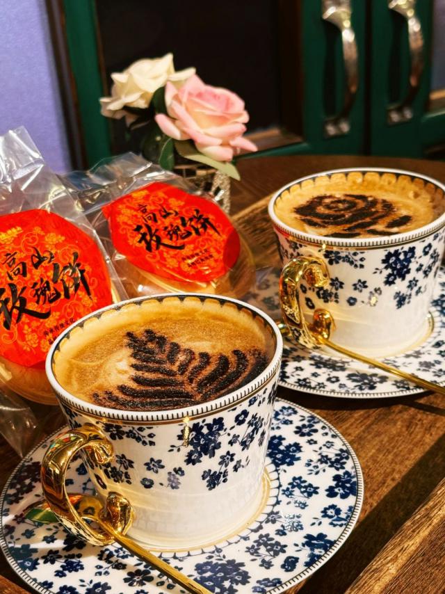 咖啡店招牌玫瑰拿铁——妙峰山大山玫瑰与巴西、哥伦比亚咖啡豆混合在一起,花香与咖啡香味交织在一起,口感醇厚甘甜。店内妙峰山玫瑰饼,酥皮包裹玫瑰酱,甜而不腻;大山玫瑰茶,清润美丽,回味悠长。