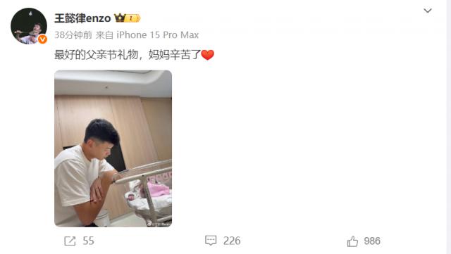 6 月 15 日,正值父亲节,网球奥运冠军王懿律发文官宣当爸爸,并表示:最好的父亲节礼物,妈妈辛苦了。